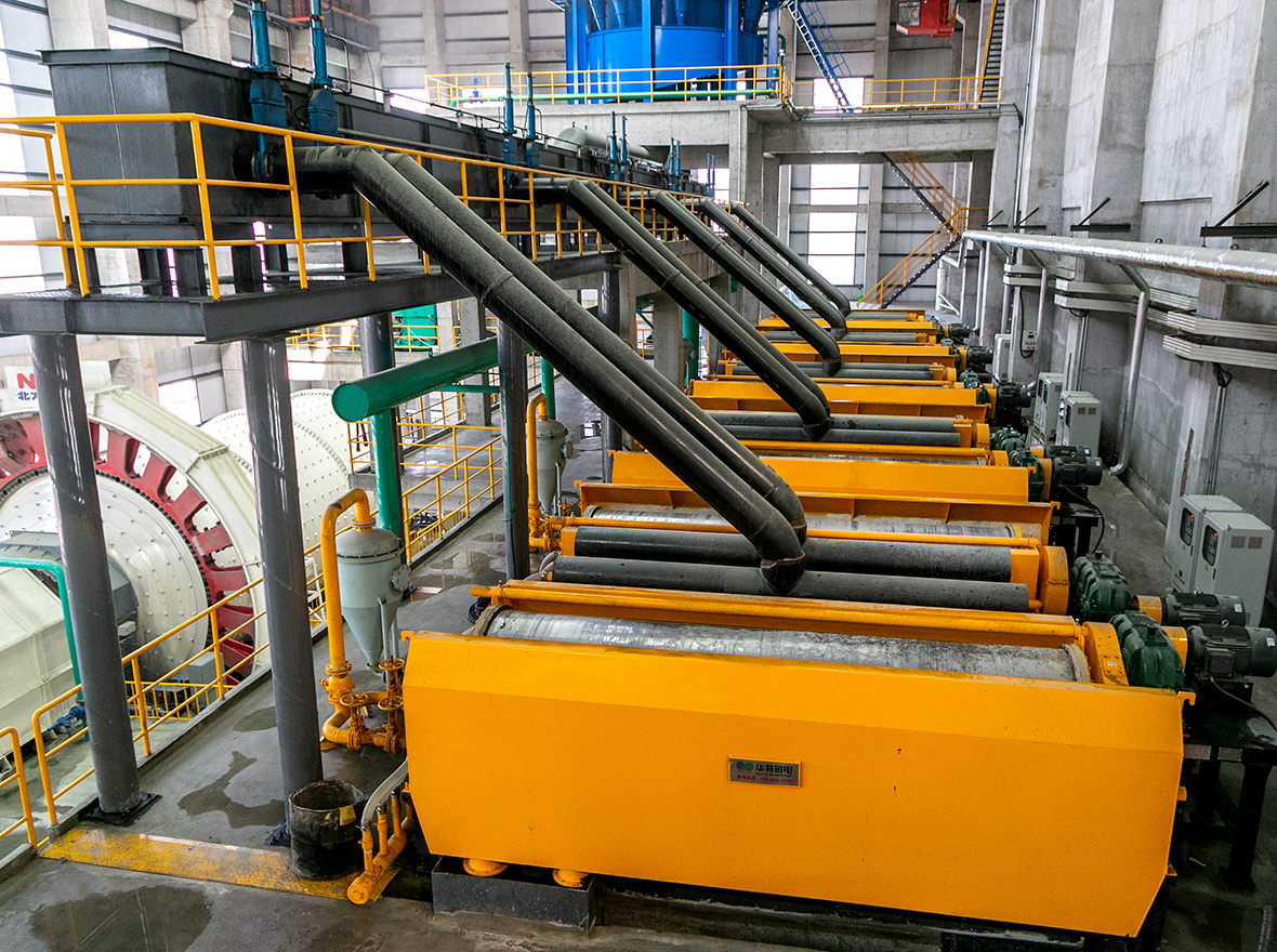 ◆采用大包角多磁极磁系结构,结合筒体内的磁搅动装置,实现矿物多次翻滚和磁搅动,并在漂洗水的作用下,充分剔除精矿中的杂质,提高精矿品位。
